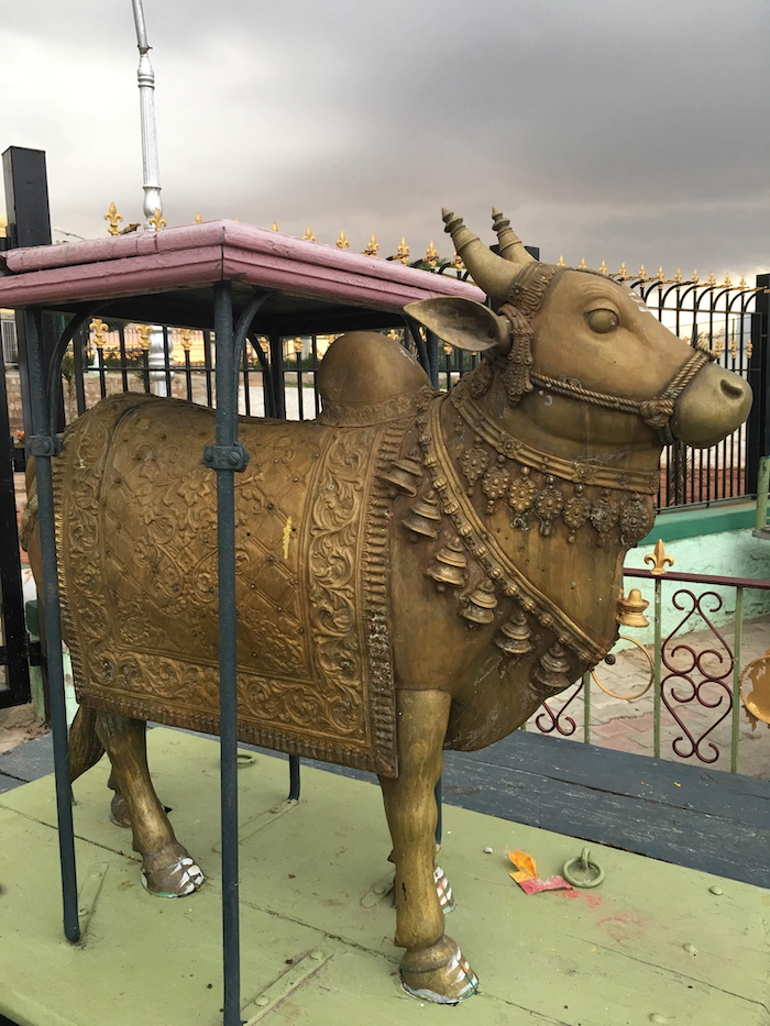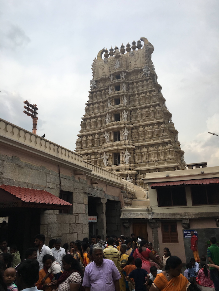 The Chamundeshwari Temple sits atop the main hill. The main hill itself features an ancient stone stairway of 1,008 steps leading to its summit. Approximately halfway to the summit is statue of bull Nandi, the vahana, or “vehicle” of Lord Shiva, which is 4.9m tall and 7.6m long and carved out of a single piece of black granite. Around this point, the steps become significantly less steep and eventually the climber is rewarded with a panoramic view of the city. The Temple has a quadrangular structure. A key feature is the statue of Mahishasura bearing a sword in his right hand and a cobra in the left. Within the temple’s sanctum stands a sculpted depiction of Chamundeshwari. She is seated with her right heel pressed against the lowest of the seven chakras. This cross-legged yogic posture echoes the posture of Lord Shiva. Worshipers believe that this powerful yogic posture, if mastered, provides an added dimensional view of the universe. Since the early days of the Maharajahs of Mysore, the idol of goddess Chamundi has been carried on a decorated elephant as part of the celebrations in the annual Dusshera Festival. From the peak of the Chamundi hills, the Mysore Palace, the Karanji Lake and several smaller temples are visible.